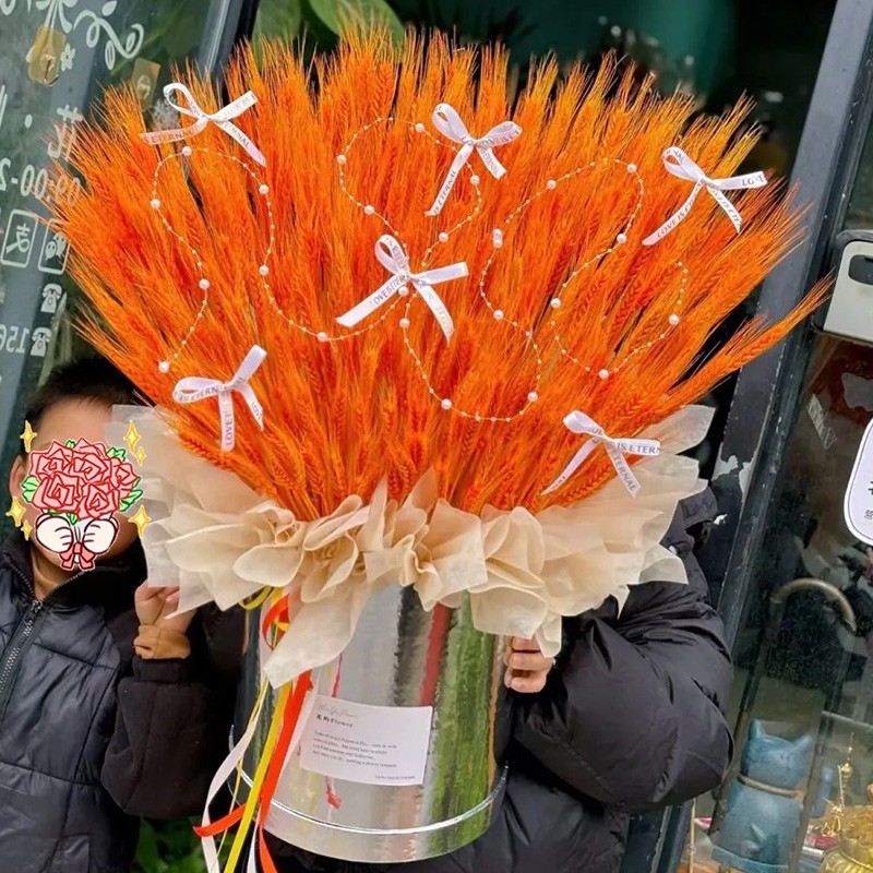 花材: 500支大麦,1条珠链,6支缎带蝴蝶结装饰表面。香槟色软纸内衬,抱抱桶(款式随机)包装,多色彩带花结。