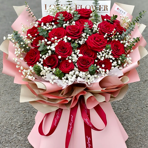 【你是我的幸福】精选20枝红玫瑰,搭配尤加利叶、白色满天星装饰。