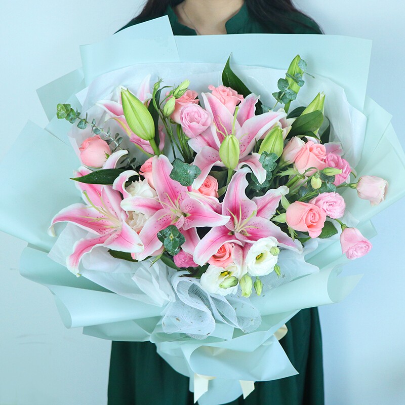 【愿安好】6朵粉玫瑰,3朵白玫瑰,5支白色多头香水百合,搭配4支洋桔梗,尤加利叶装饰。