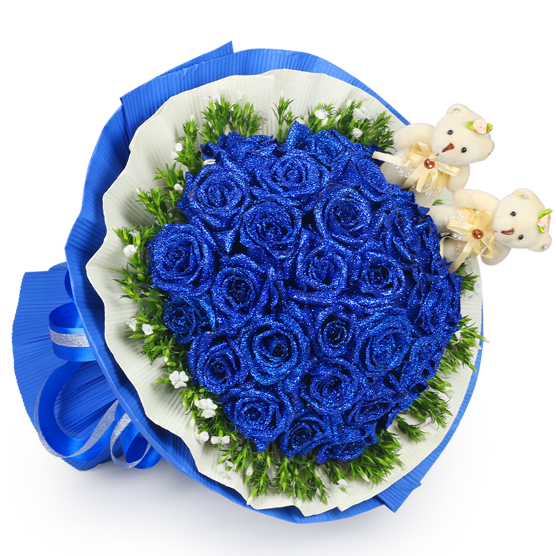【最美的你】33支精品蓝色妖姬、2只可爱小熊,搭配适量白色洋桔梗、叶上黄金、绿叶间插。