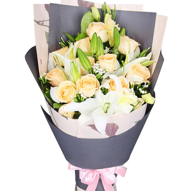 【初晴夜雨】9朵香槟玫瑰,3支多头白百合,搭配桔梗、尤加利叶装饰。