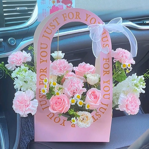 【柔光】精选4支粉色康乃馨、粉玫瑰混搭,4支多头洋桔梗,4支粉色折射玫瑰,搭配尤加利叶装饰。