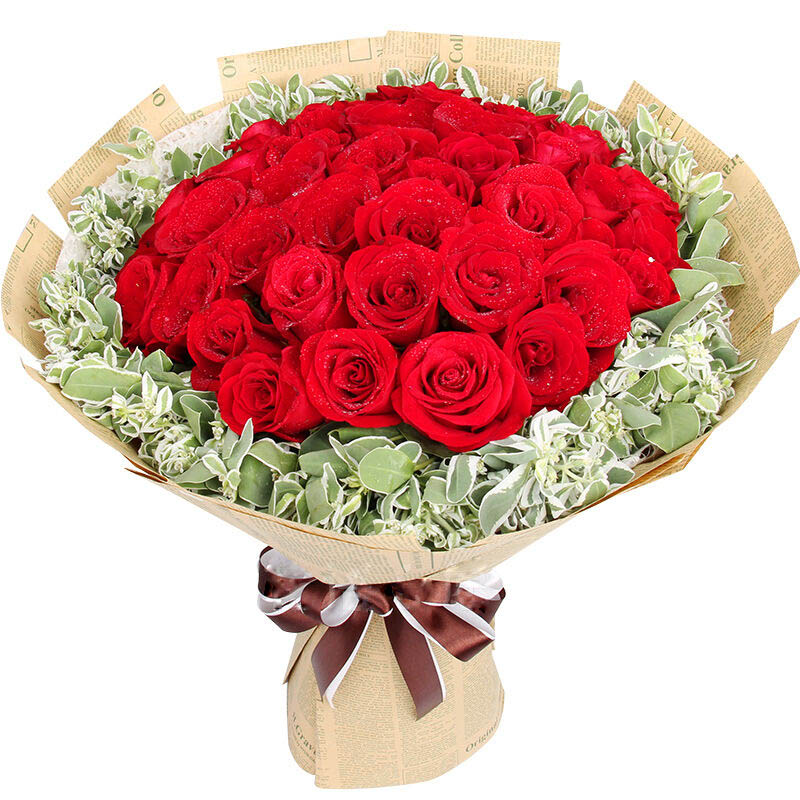 【爱你一生】33朵红玫瑰,搭配叶上金点缀。