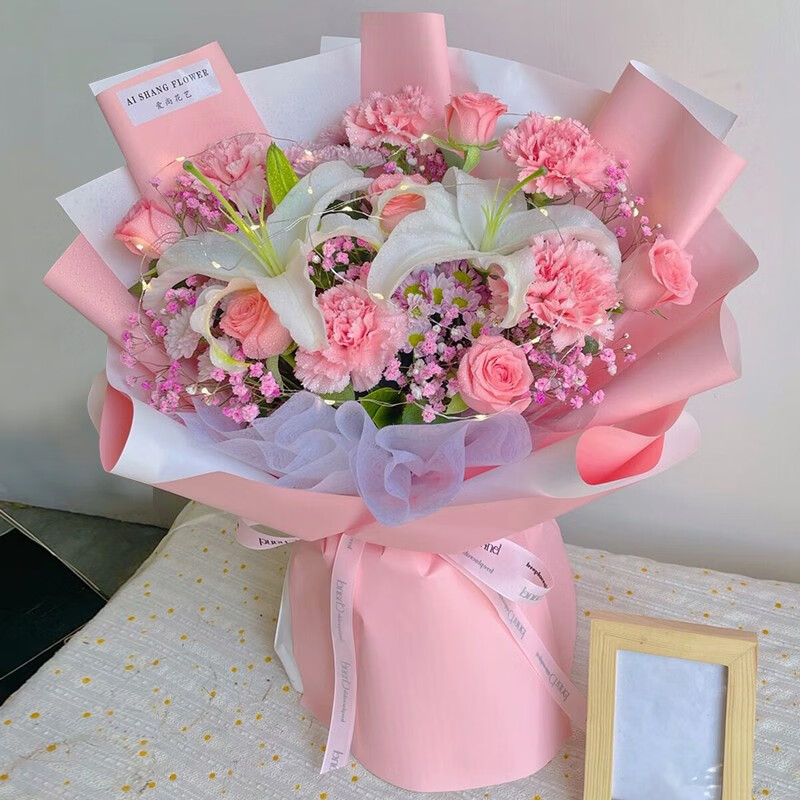 【全心全意】11朵粉色康乃馨玫瑰混搭,1支多头白百合,1条灯带,搭配粉色满天星。