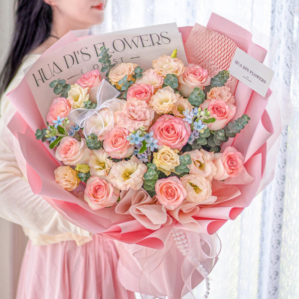 【粉色精灵】11枝戴安娜粉玫瑰,2枝多头粉百合,白色满天星,尤加利叶间插点缀。