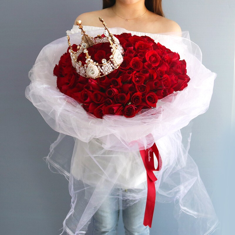 【黑夜之光】99支顶级红玫瑰,搭配皇冠、灯带装饰,满天星环绕。