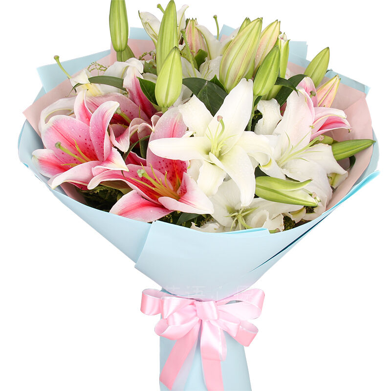 【不负韶华】红玫瑰、粉玫瑰混搭共11朵,白色、粉色多头香水百合共8支,搭配洋桔梗、尤加利叶装饰。
