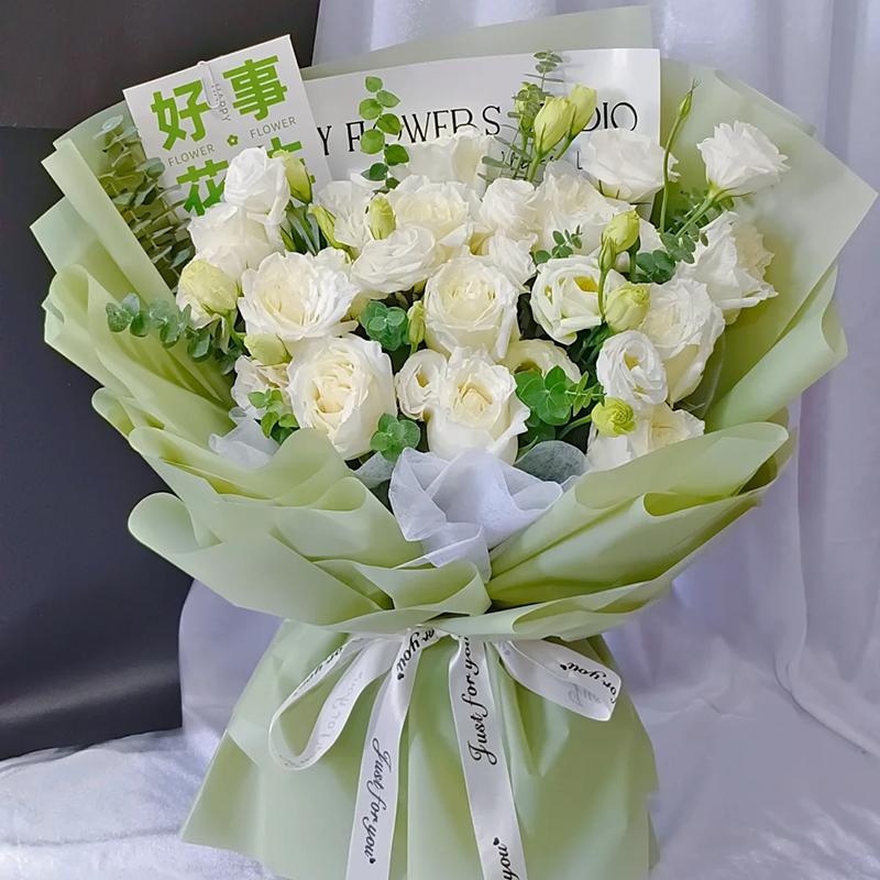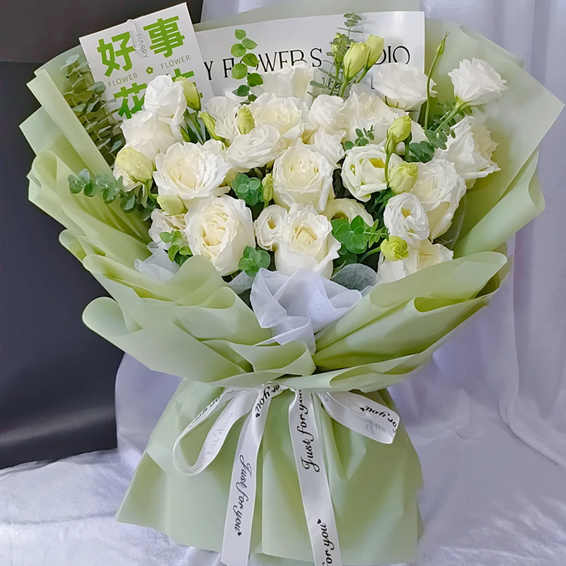 花材: 精选11朵白玫瑰,5枝多头洋桔梗,搭配尤加利叶装饰。