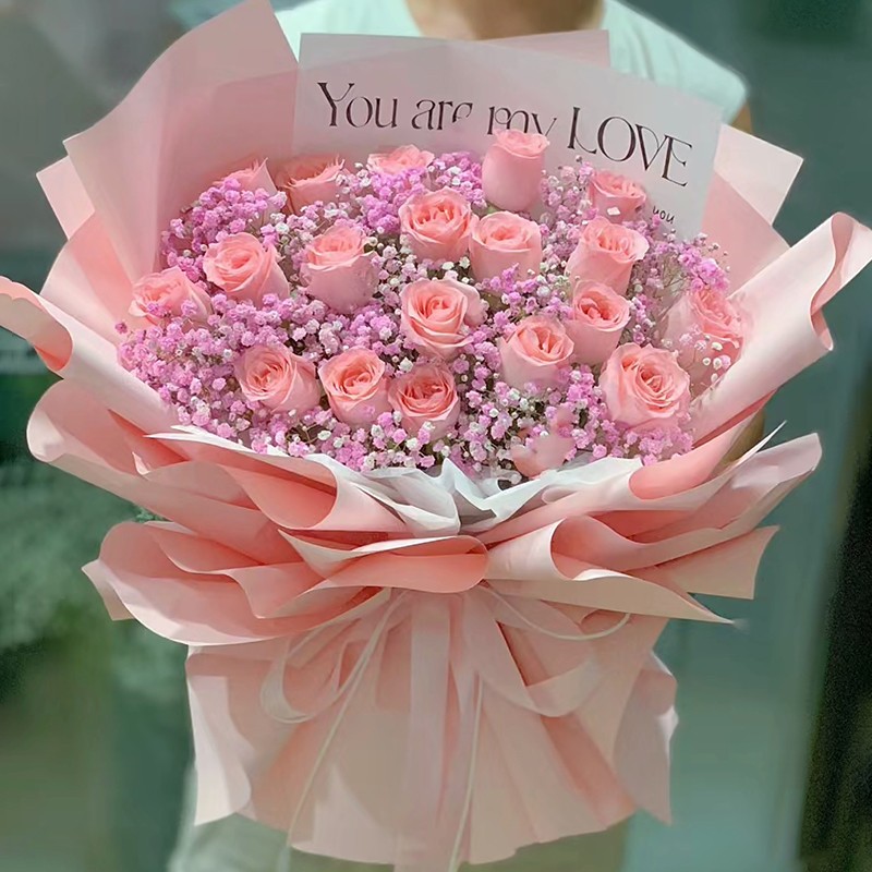 花材: 19朵戴安娜粉玫瑰,粉色满天星间插丰满。
