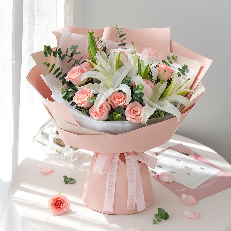 花材: 精选11朵粉玫瑰、多头白色香水百合2枝、尤加利叶装饰。
