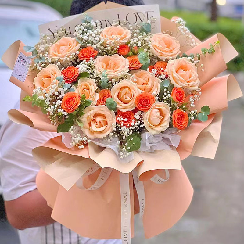 花 材:11支精品香槟玫瑰,搭配6支橙色多头小玫瑰,满天星,尤加利叶装饰。
