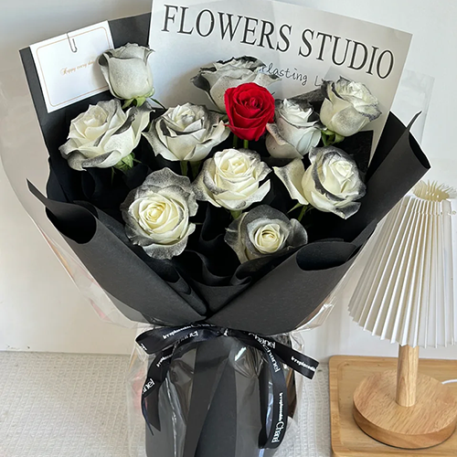 花材: 精选10朵黑骑士玫瑰,1朵红玫瑰。