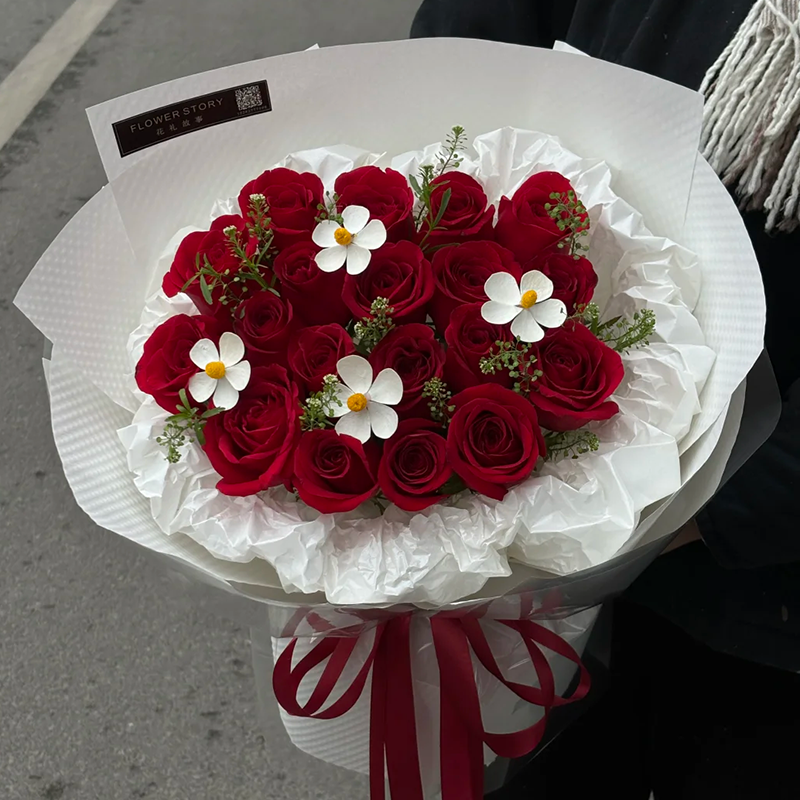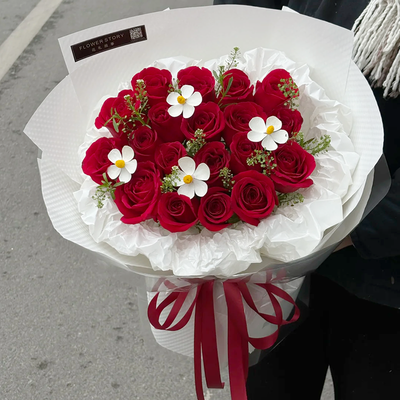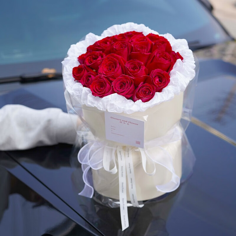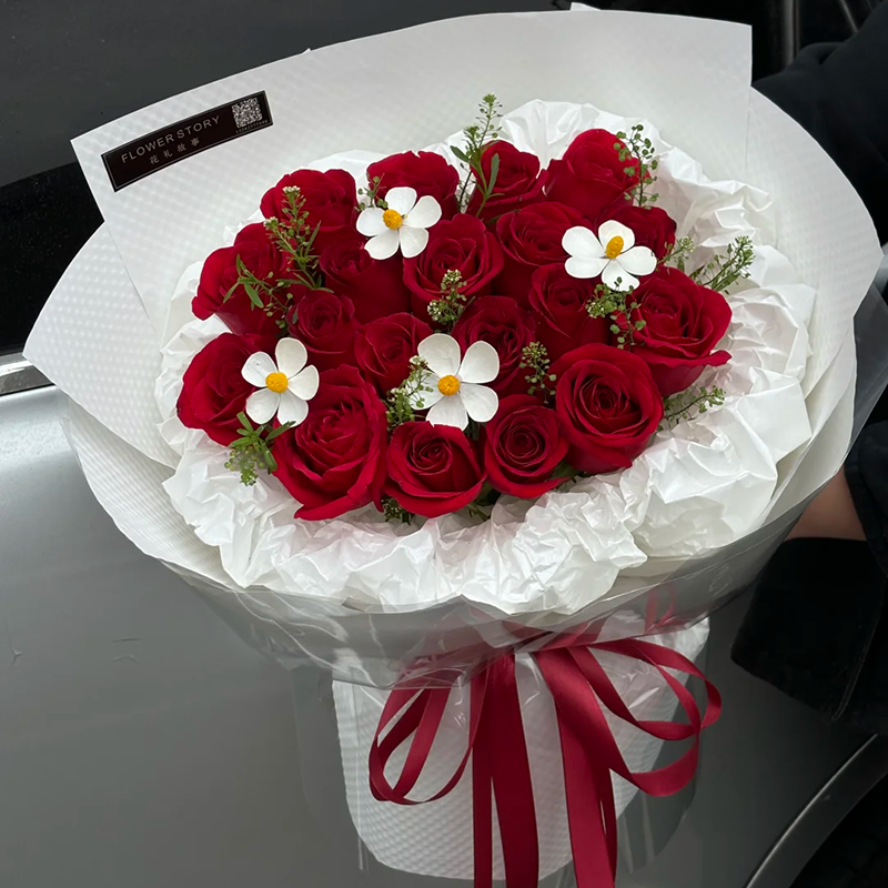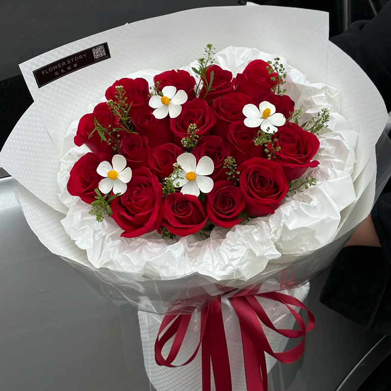 花材: 精选19枝红玫瑰,4支紫罗兰永生花,绿铃草或黄莺草装饰。