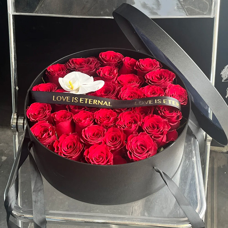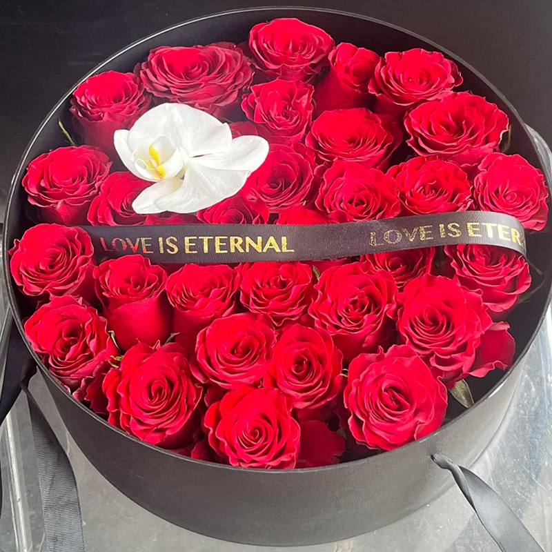 花材: 精选33枝红玫瑰,1朵蝴蝶兰,黑色英文缎带装饰花面。