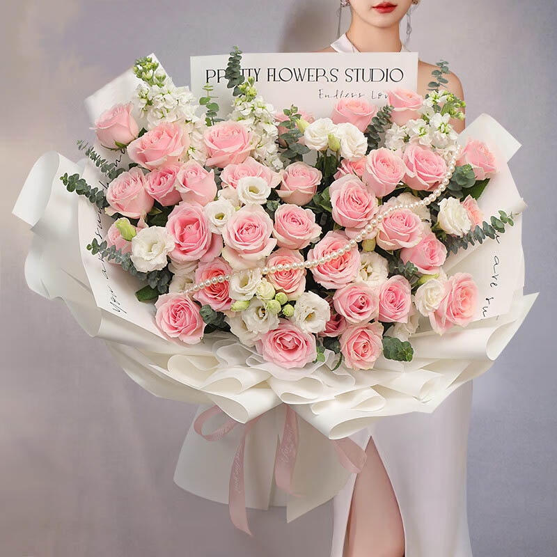 花 材:33支精品粉玫瑰,8支多头洋桔梗,1条珠链,搭配白色紫罗兰(非应季则用白色配花代替),尤加利叶装饰。