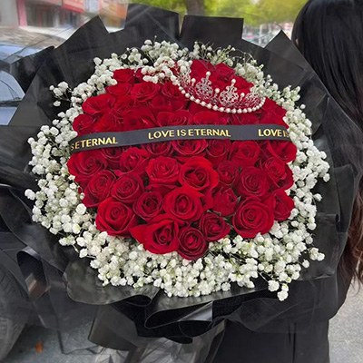 花 材:精选52朵顶级红玫瑰,1顶皇冠(款式随机),白色满天星环绕,黑色英文缎带装饰花面。