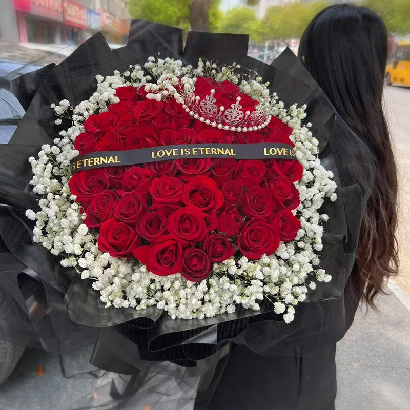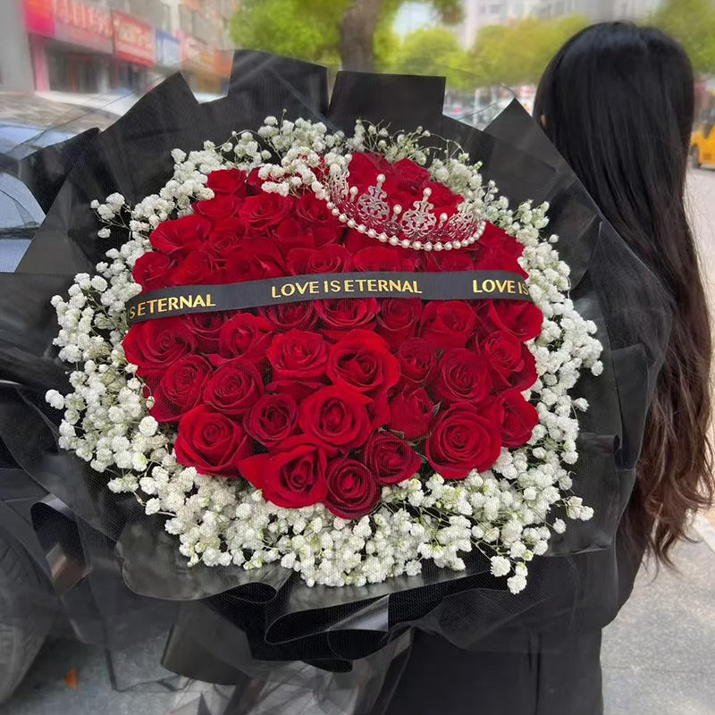 花材: 精选52朵顶级红玫瑰,1顶皇冠(款式随机),白色满天星环绕,黑色英文缎带装饰花面。