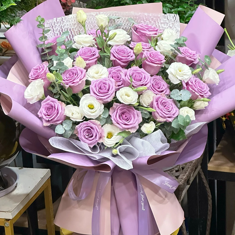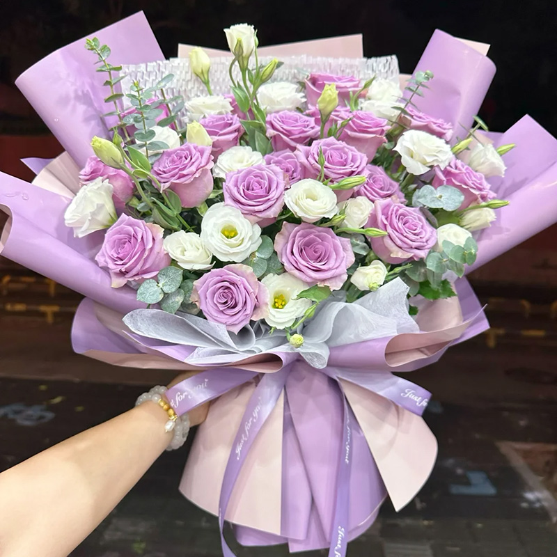 花材: 精选19朵紫霞仙子紫玫瑰,6支多头浅色洋桔梗,搭配尤加利叶装饰。