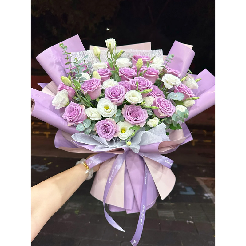 花 材:精选19朵紫霞仙子紫玫瑰,6支多头浅色洋桔梗,搭配尤加利叶装饰。