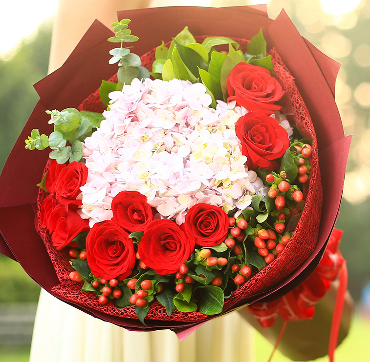 花材: 9朵红玫瑰,2只绣球花,搭配红豆、尤加利叶、栀子叶。