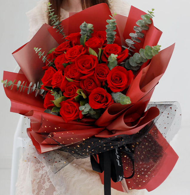 花材: 19支精品红玫瑰,搭配适量尤加利叶、栀子叶装饰。