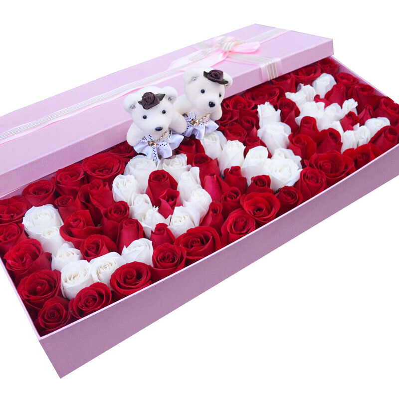 花材: 99枝(红玫瑰+白玫瑰)拼成LOVE字样,一对情侣小熊。