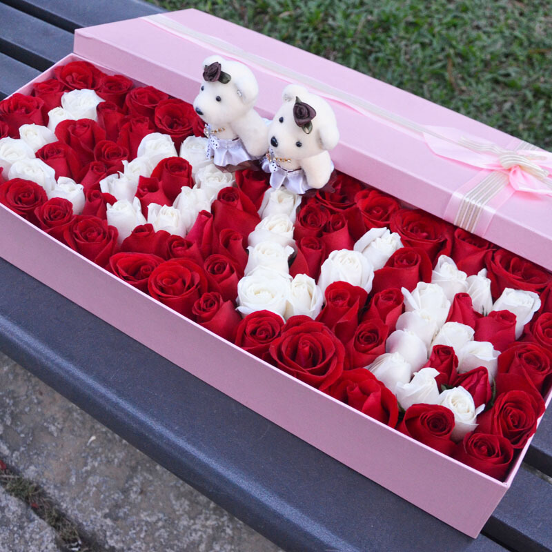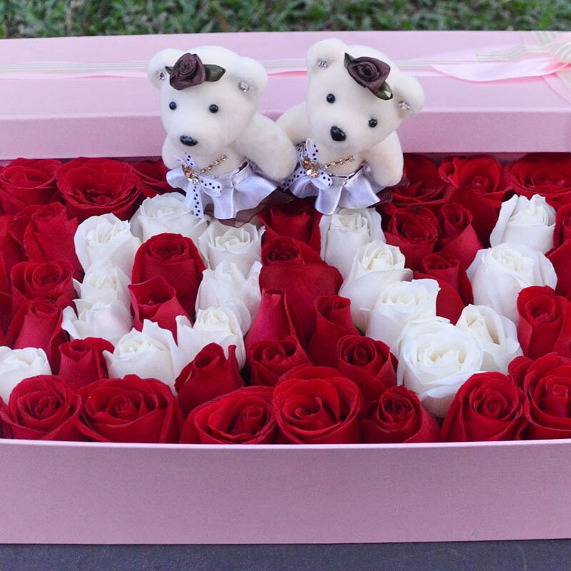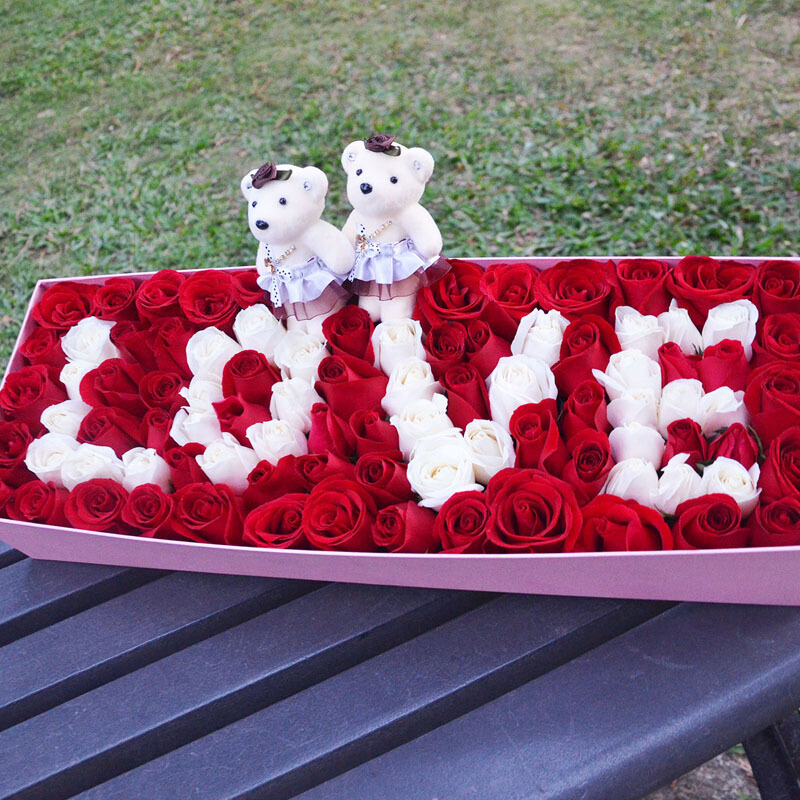 花 材:99枝(红玫瑰+白玫瑰)拼成LOVE字样,一对情侣小熊。