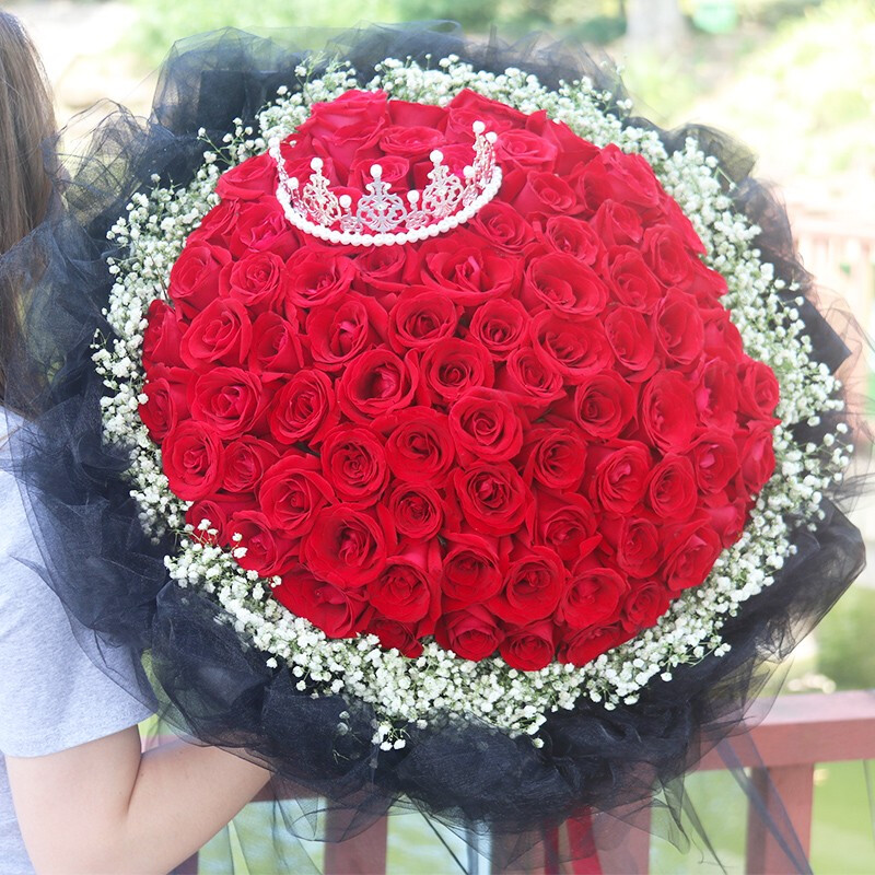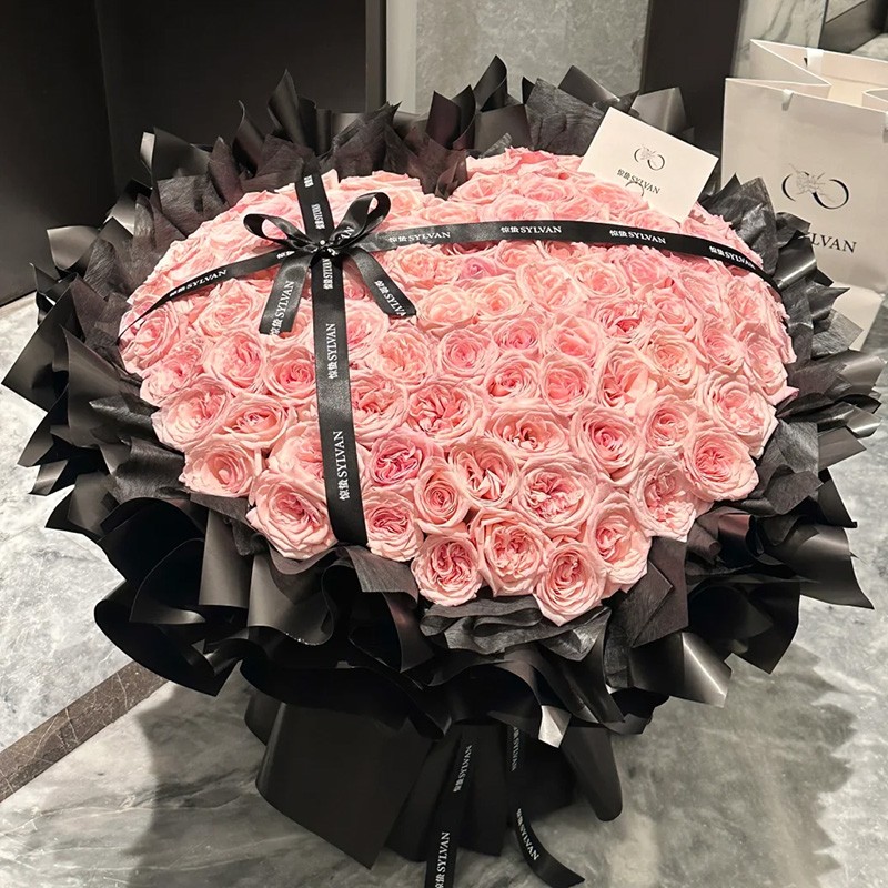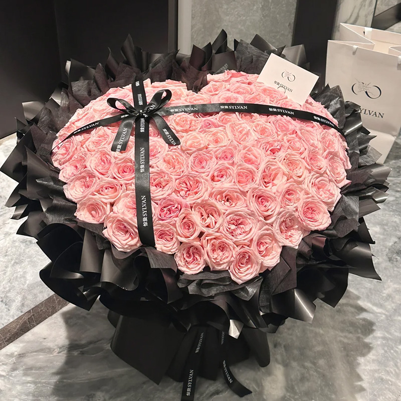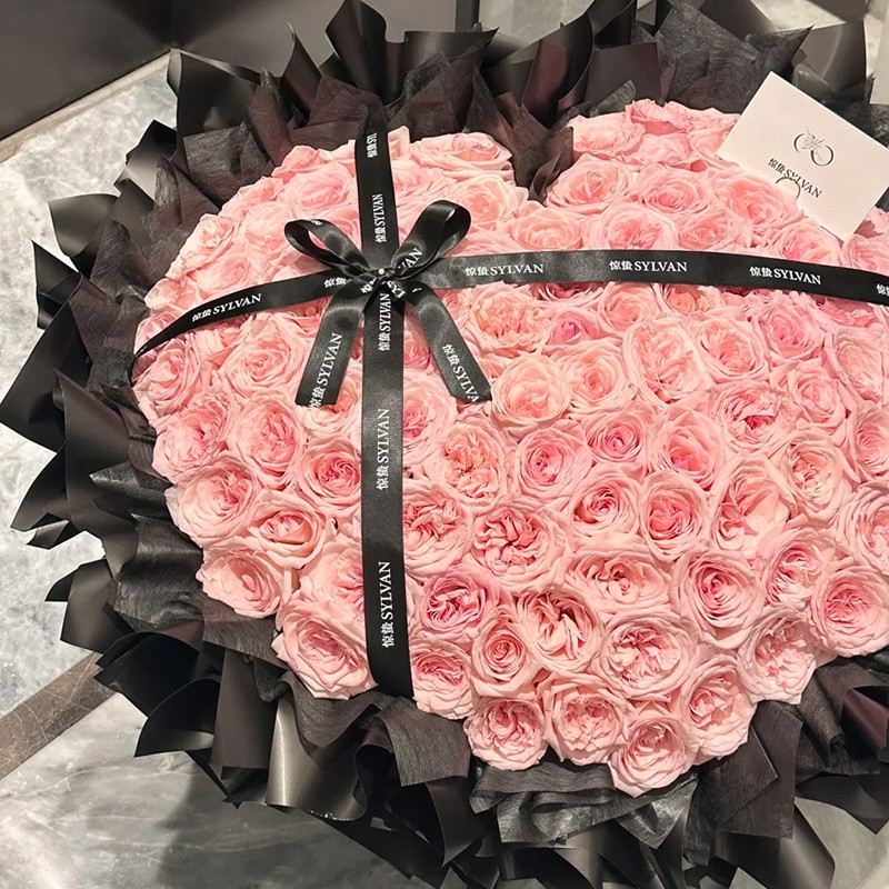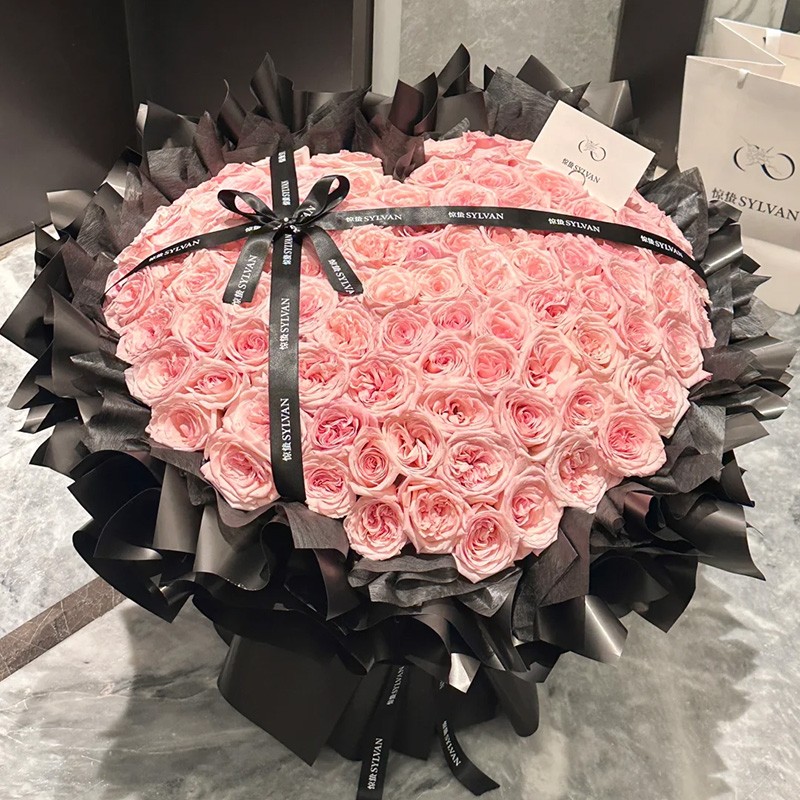 花材: 精选99枝粉荔枝玫瑰,黑色缎带装饰花面。