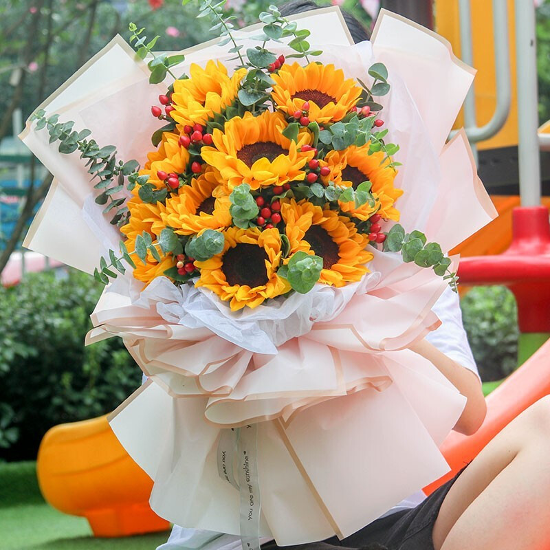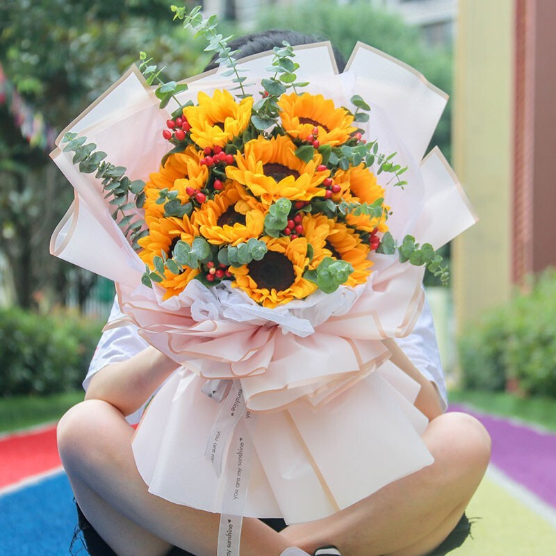 花材: 9枝向日葵,搭配红豆、尤加利叶装饰。