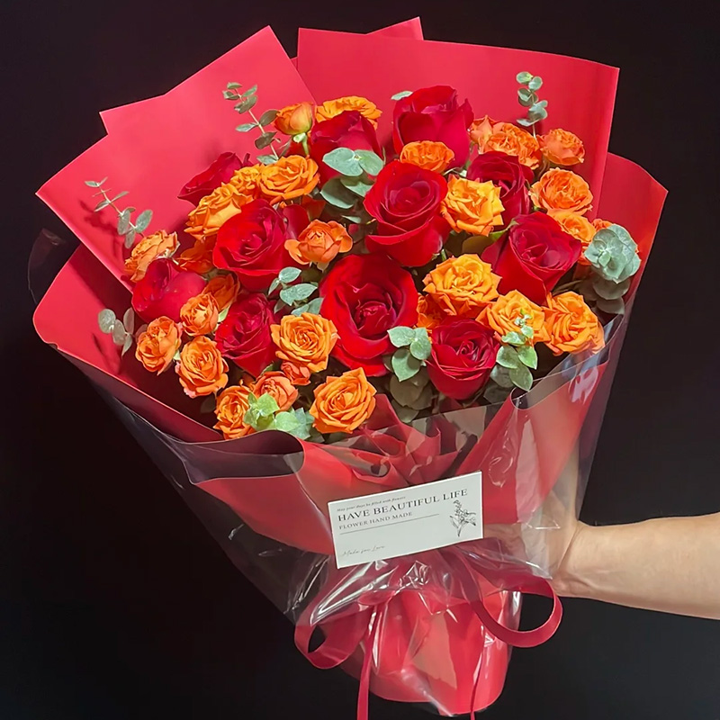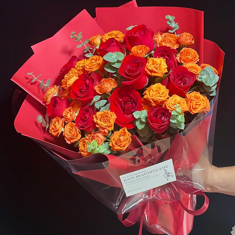 花材: 11枝红玫瑰,8枝多头橙芭比,搭配尤加利叶装饰。