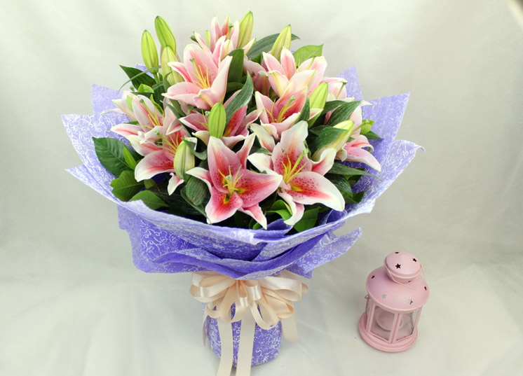 花 材:8枝粉色多头西伯香水百合,搭配绿色新鲜叶材。