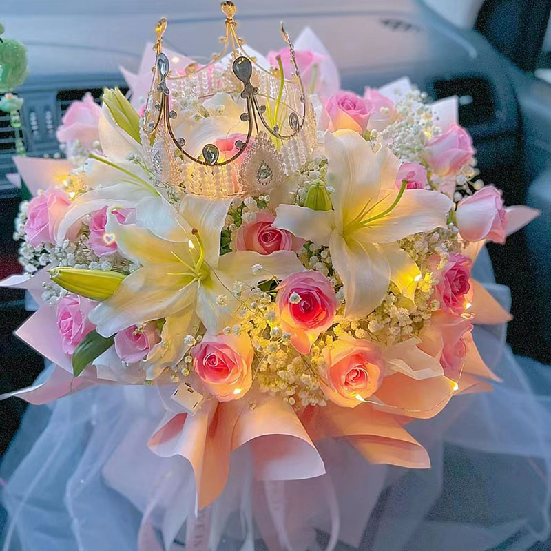 花材: 精选19朵粉玫瑰,4支多头白色香水百合,1条灯带,1个皇冠(款式随机),搭配满天星、尤加利叶间插。