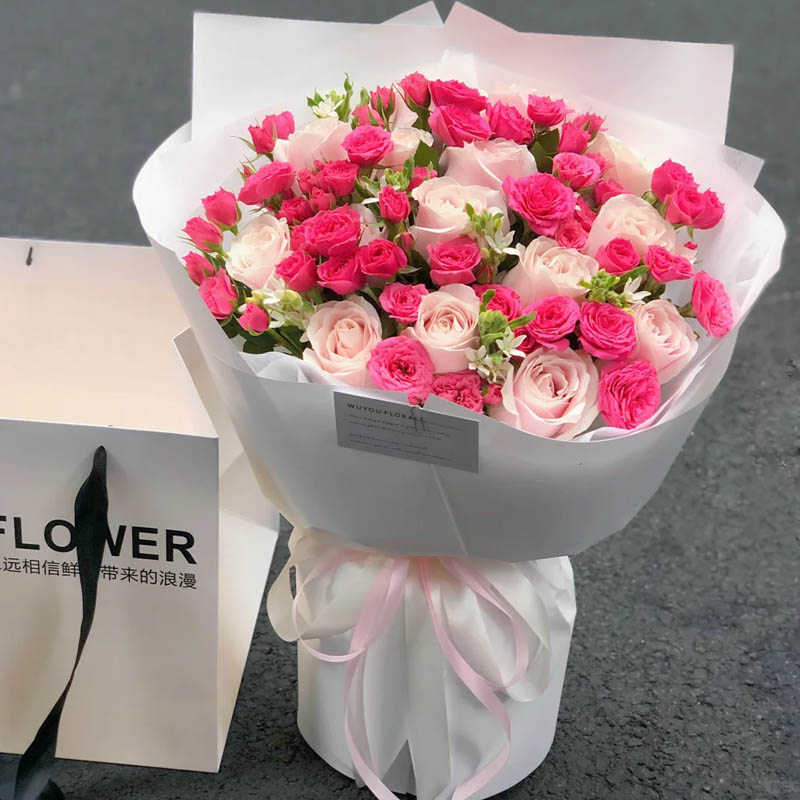 包装: 白色雪梨纸内衬,白色韩素纸外包,粉色/白色花结。
