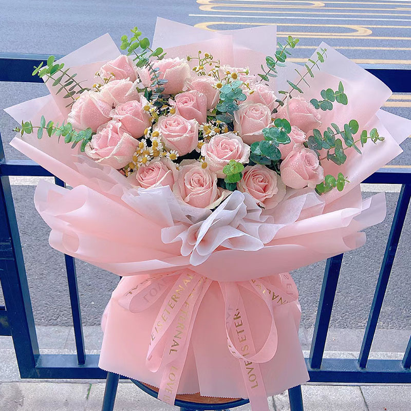 花 材:19朵粉玫瑰,搭配尤加利叶、洋甘菊装饰。