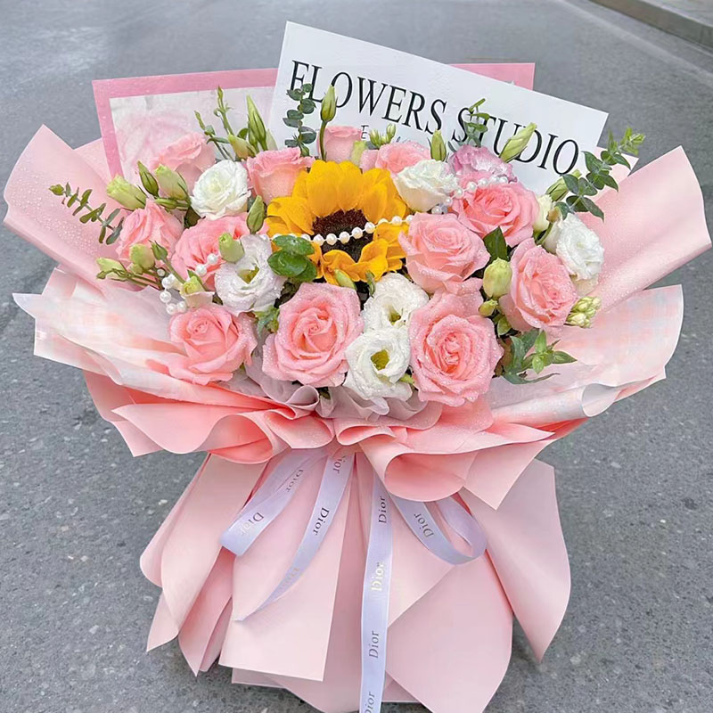花 材:12朵粉玫瑰,1朵向日葵,1条珠串,6支白色洋桔梗(断货则用6支白玫瑰代替),搭配尤加利叶装饰。