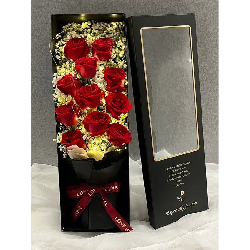 花 材:11朵红玫瑰,1条灯带,搭配满天星丰满包扎。