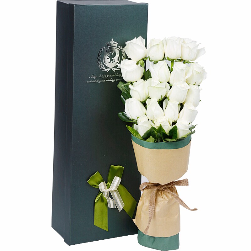 花材: 精选19枝顶级白玫瑰,搭配绿叶点缀。