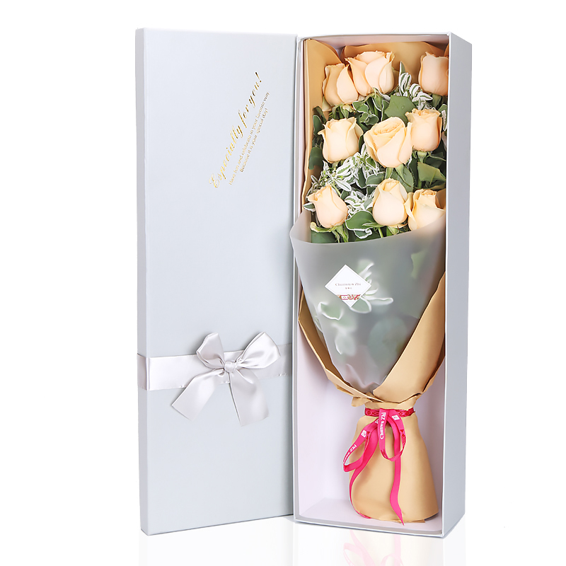 花 材:9支精品香槟玫瑰,搭配适量银边翠间插。