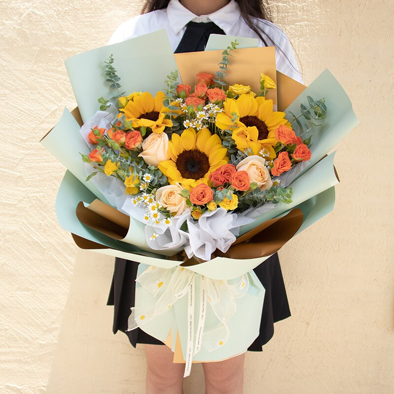 花 材:3朵向日葵,3朵香槟玫瑰,6支多头橙色、黄色混搭小玫瑰,尤加利叶装饰。