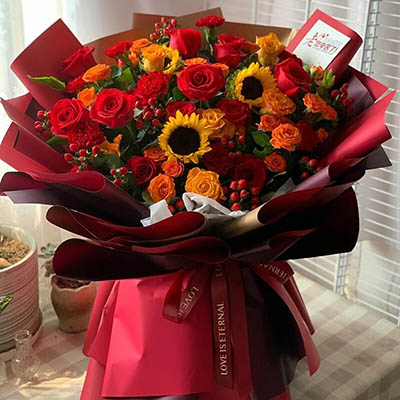 花材: 精选3朵向日葵,19朵红色玫瑰与红色康乃馨混搭,5支多头橙色泡泡,搭配红豆、尤加利叶装饰。