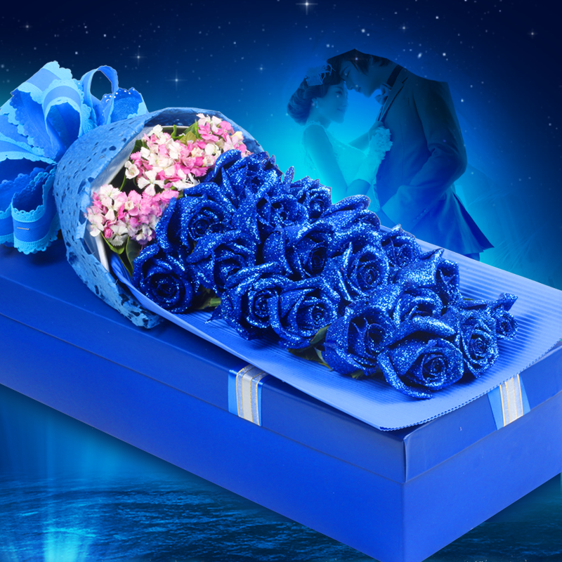 花 材:19朵精品蓝色妖姬,搭配石竹梅装饰。