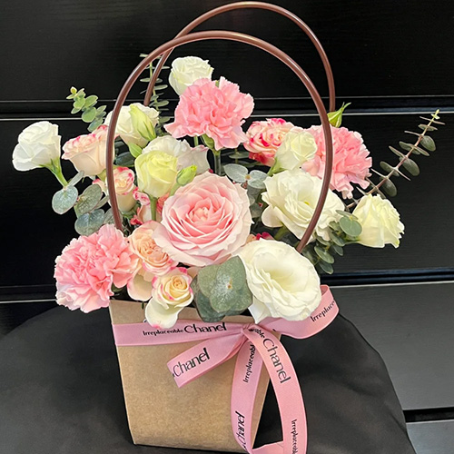 花 材:精选4支粉色康乃馨、粉玫瑰混搭,4支多头洋桔梗,4支粉色折射玫瑰,搭配尤加利叶装饰。