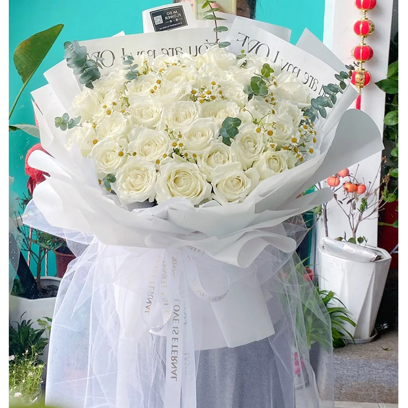 花 材:33朵白玫瑰,搭配洋甘菊,尤加利叶装饰。