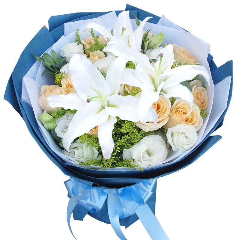 花 材:精选11支香槟玫瑰,3朵白色香水百合,搭配桔梗、黄莺。