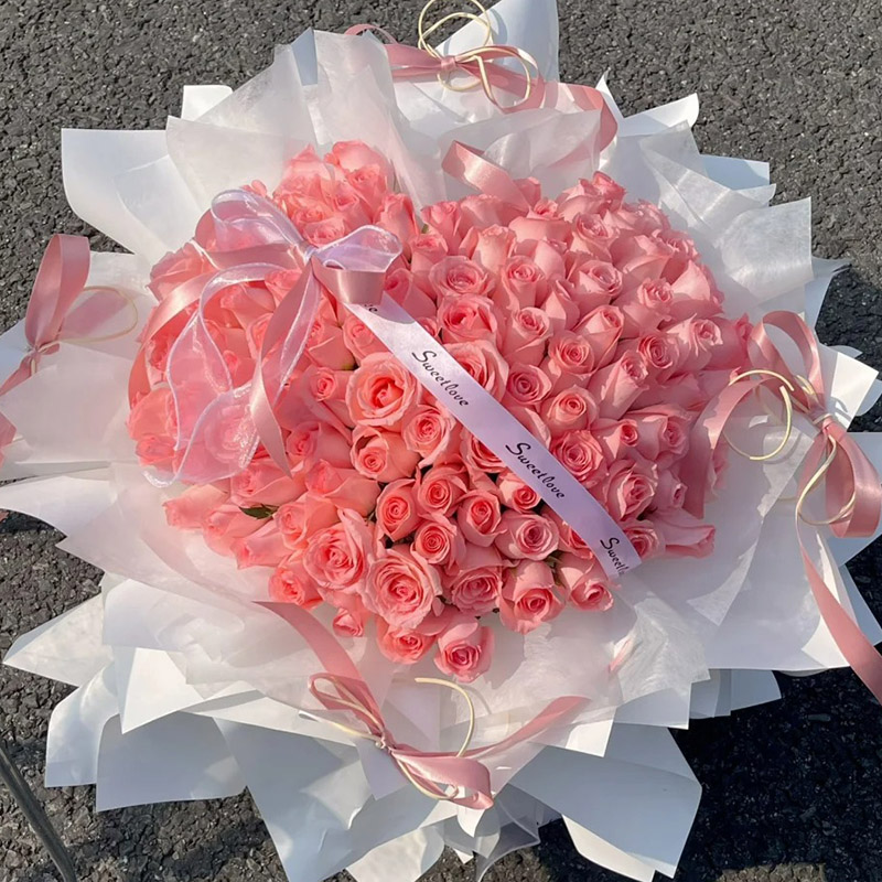 花材: 99朵戴安娜粉玫瑰,心形造型,搭配1条白色英文缎带装饰花面。