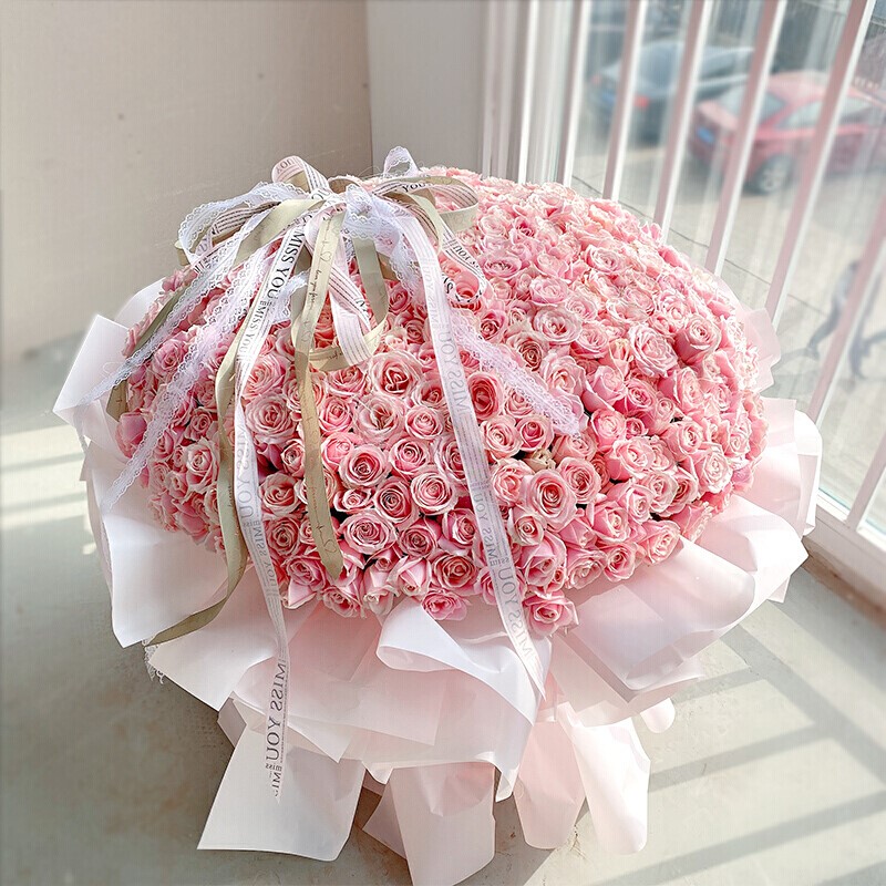 花 材:精选520朵优质粉玫瑰,花球造型,鲜花表面用绿色白色缎带花结装饰。