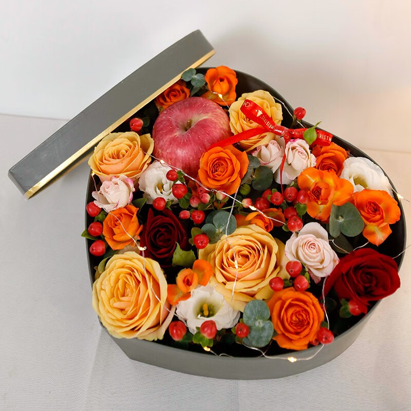 花 材:1颗苹果,5朵香槟玫瑰,2朵红玫瑰,6支多头小玫瑰(断货则用6支金辉玫瑰代替),5支洋桔梗,搭配红豆,尤加利叶。