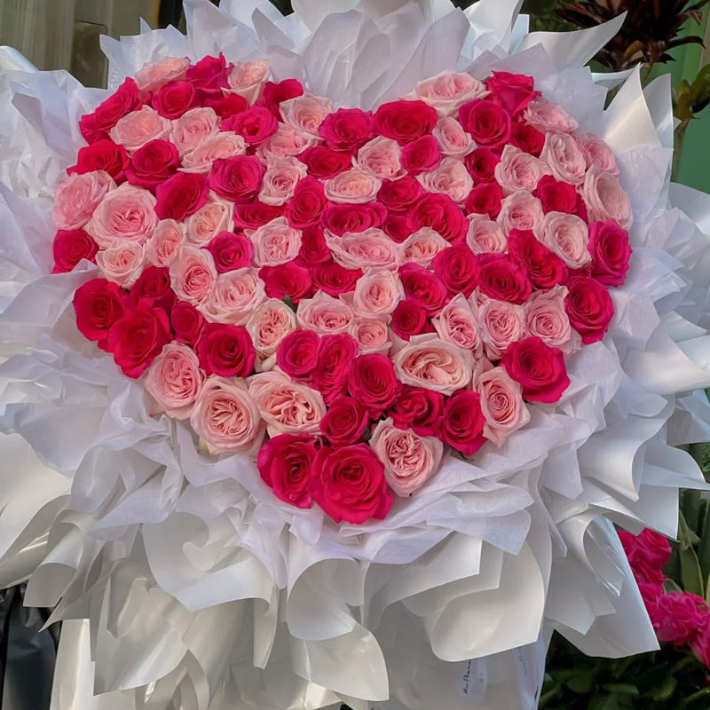 花材: 精选99朵红色粉色玫瑰(粉荔枝玫瑰和弗洛伊德红玫瑰共99朵)混搭。